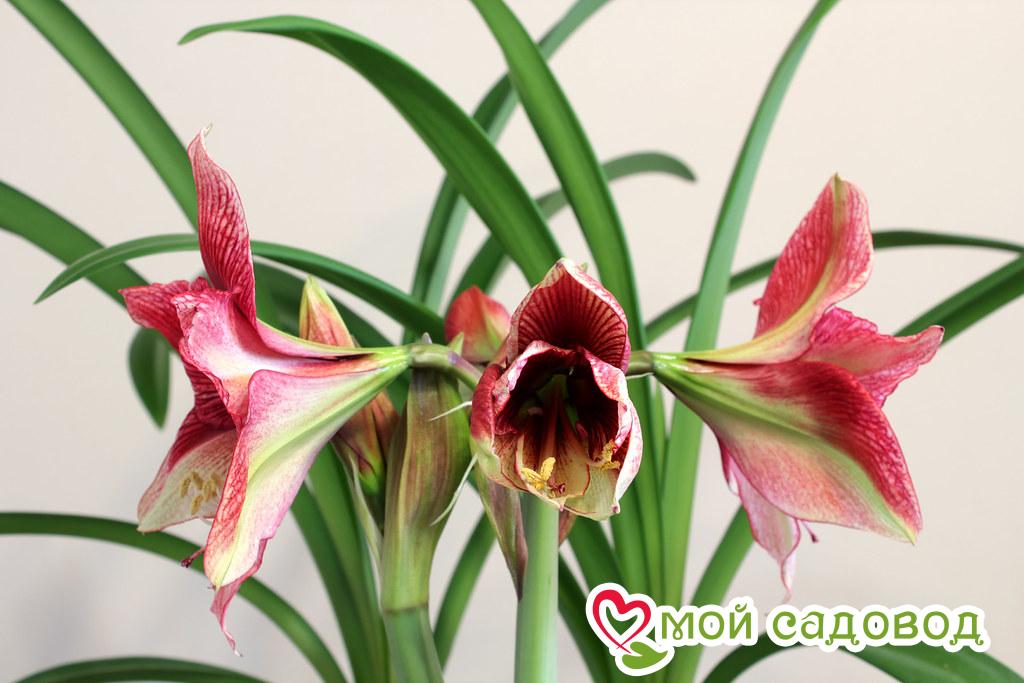 Амариллис Тоска (Tosca) — Цветок сочетает в себе три оттенка, что бывает очень редко. Это красновато-фиолетовый и белый. Расцветка просто очаровывает. Амариллис — это луковичное многолетнее растение. Цветки размером до 16 см. Цветок без запаха. Листья глянцевые, ремневидные, темно-зеленого цвета. Луковица мясистая, округлая, чуть вытянутая. Имеет размер до 10 см в диаметре. Она производит один-два цветоноса, на котором распускается по 3-4 цветка. Высота растения –50-70 см. Цветение: круглый год. Высадка луковицы На дно горшка укладываем дренаж из керамзита или мелких камешков. Слой в 2 – 2,5 см. Сверху насыпаем землю, по центру ставим луковицу и засыпаем ее по бокам, оставляя верхнюю треть луковицы без земли. Поливаем отстоянной водой комнатной температуры. После посадки луковицы, примерно через месяц должно наступать цветение, которое будет продолжаться в течение 2-х или 3-х недель. Место Амариллис очень любит светлые открытые места. Идеально подойдут южные и юго-восточные окна. На лето можно высаживать в открытый грунт с южной стороны, в защищенном от ветров месте. Не любит сквозняков, особенно в зимнее время. Температура Во время бурного цветения, ему будет комфортно при температуре в +23 – 25 °C. В ночное время, допустимо снижение температуры до +18 – 20 °C. Чтобы продлить срок цветения, можно понизить температуру окружающей среды примерно до 18 °C и  убрать излишнее освещение.