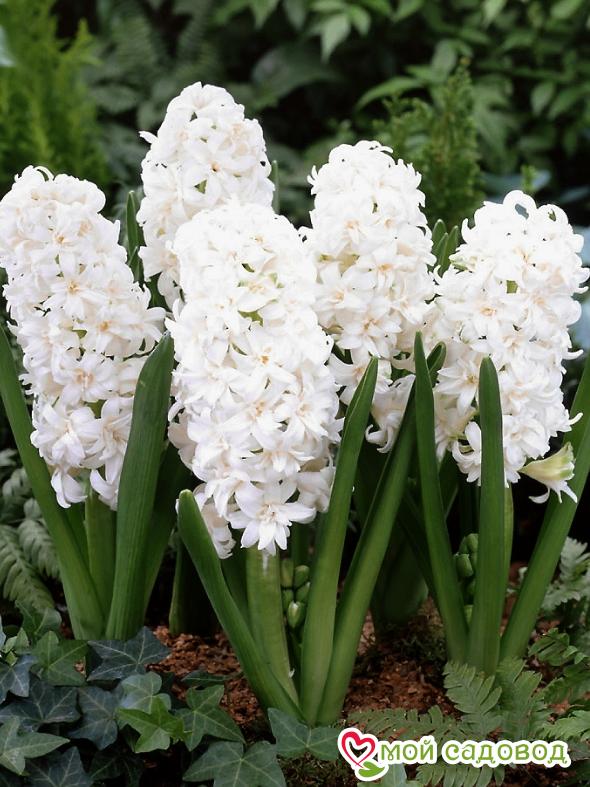 Это один из первых и наиболее популярных восточных сортов. Принадлежит растение к классу махровых гиацинтов. Многолетник активно выращивают на частных усадьбах и городских территориях. Купить недорого качественный посадочный материал можно в нашем интернет-магазине. Как выглядит растение? Время цветения у представленного на фото сорта позднее. Обычно этот период приходится на конец апреля и длится 17 – 20 дней. Соцветия формируются рыхлые и пышные, высотой 12 – 15 см. Состоят они из 20 махровых цветков. В полном роспуске их диаметр равен 4 – 4,5 см. Лепестки окрашены в белый цвет. Взрослый гиацинт достигает в высоту 20 – 25 см. Аромат тонкий и приятный. Применение в ландшафтном дизайне Это отличный вариант для наполнения цветников, создания оригинальных композиций и оформления рабаток. Флористы используют необычные цветки для весенних букетов и украшения торжественных залов. Советы по посадке и выращиванию Выращивать Мадам Софи желательно рядом с вечнозелеными хвойниками. Как вариант, можно разместить гиацинт под плакучими деревьями, у которых листва распускается с приходом весны. Дело в том, что белый цвет не привлекательно смотрится на только что оттаявшей голой земле. Также важно выбрать место без близкого расположения почвенных вод. К работе приступают в начале осени. Лунки выкапывают исходя из размеров посадочного материала. На дно насыпают небольшой дренаж из песка и плодородную почвосмесь. После завершения процесса клумбу обильно поливают и мульчируют древесной стружкой, скошенной травой или торфом. Это поможет сохранить влагу и защитить землю от перегрева. Положительные качества гиацинта Мадам Софи К неоспоримым достоинствам сорта относятся: доступная цена; хорошая приживаемость; нетребовательность к уходу; высокая сопротивляемость болезням и вредителям; универсальность в применении. Купить недорого гиацинты можно в интернет-магазине «Мой садовод». Просто отправьте понравившийся сорт в корзину, нажав на соответствующую кнопку. Мы бережно упакуем и максимально быстро доставим Вашу покупку ТК СДЭК или почтой России. Если возникнут вопросы или сложности с оформлением заказа, наши консультанты предоставят квалифицированную помощь. Мы гарантируем высокое качество посадочного материала и дорожим мнением каждого покупателя!