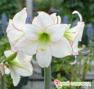 Специально выведенные сорта, более морозостойкие, чем остальные гиппеаструмы. Обильноцветущие, генетически низкорослые. Из одной луковицы появляется несколько стеблей и много бутонов. Цветки, воронковидные или трубчатые, располагаются на длинных черешках. Окраска цветка красный с белыми мазками, стебли коричневые, стебли коричневые. Предпочитает легкую, хорошо дренированную почву. Удобны для выращивания в горшках и вазонах. Легко выращиваются на открытом воздухе. Высадка луковицы На дно горшка укладываем дренаж из керамзита или мелких камешков. Слой в 2 – 2,5 см. Сверху насыпаем землю, по центру ставим луковицу и засыпаем ее по бокам, оставляя верхнюю треть луковицы без земли. Поливаем отстоянной водой комнатной температуры. После посадки луковицы, примерно через месяц должно наступать цветение, которое будет продолжаться в течение 2-х или 3-х недель. Место Амариллис очень любит светлые открытые места. Идеально подойдут южные и юго-восточные окна. На лето можно высаживать в открытый грунт с южной стороны, в защищенном от ветров месте. Не любит сквозняков, особенно в зимнее время.