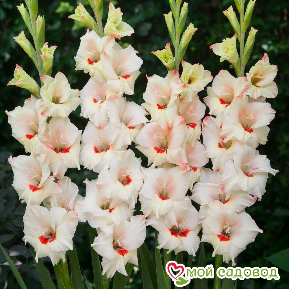 Гладиолус Конфетка Кэнди Бар (Candy Bar) – очаровательные, нежного светлого-кремового окраса, с яркими серединками, цветы. Растение любит теплое место и достаточно светлое по уровню освещенности. В уходе гладиолус Кэнди Бар неприхотливый. Цветение — долгое, на протяжении месяца при правильном поливе и хороших условий посадки. Высаживают на выбранный участок без сквозняков, в открытый грунт с плодородной, легкой удобренной землей, на глубину, кратную трем луковицам. Высаживают эти растения в цветочные композиции. После долгого цветения — на зимовку в конце сентября-начале октября луковицы выкапывают и сохраняют до следующего сезона, в прохладном темном месте.  Высота до 90 см. Размер цветка до 9 см. Полив обильный. Низкая устойчивость к вредителям. Посадка. Из-за погодно-климатических особенностей в разных регионах России сроки посадки отличаются: На Юге (Краснодарский край (Кубань), Северный Кавказ) — сажать можно уже в конце апреля. В Средней полосе (в т. ч. Подмосковье) — оптимальное время приходится на начало или середину мая. В Сибири, на Урале, в Ленинградской области — в середине или конце мая. Места посадки должны быть солнечными, без сквозняков и с качественно дренированной почвой. Затенённые участки плохо сказываются на развитии культуры. Однако в южных районах небольшое затенение допускается. Глубина высадки луковиц обычно составляет 8-10 см (для мелких), 10-15 см (для крупных). Полив. Средняя частота поливов культуры составляет раз в неделю, а летом, в жаркие дни, один раз в 3-4 суток. Поливают утром или вечером, используя около 10-12 л воды на 1 м2. Полив производят в специально подготовленные междурядные борозды, углублённые до 30-50 мм с тем, чтобы капли воды не попадали на листики гладиолусов. Без регулярного полива цветы быстро завянут. По завершении процедуры кусты окучивают. Раз в декаду обязательно производят рыхление почвы.