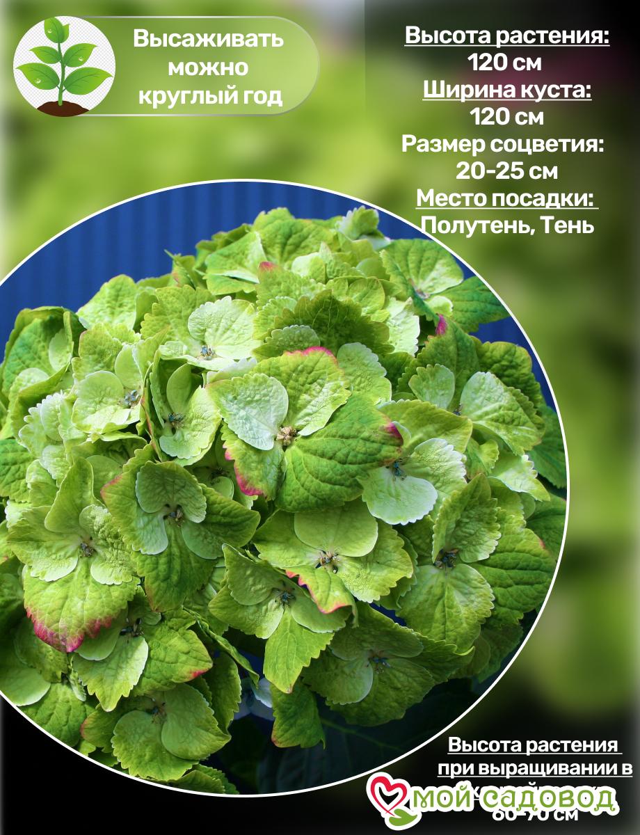 Гортензия крупнолистная ‘Magical Green Cloud’ – сорт входит в королевскую серию, выведенную из-за их компактного роста и способности повторять цветение в течение всего лета. У Green Cloud большие зеленые соцветия с белой зоной вокруг глазка, возвышающиеся над зелеными листьями с зубчатыми краями. Высота и ширина кустарника около 1,2 м. Цветки с возрастом становятся огненно-красными и сохраняю свой цветущий вид до сильных морозов. Гортензия имеет жесткие стебли, потому идеально подходит под срезку. УХОД Гортензии влаголюбивы. При отсутствии дождей раз в неделю их необходимо поливать из расчета 15-20 л на куст, при наличии дождей достаточно одного полива в месяц. Чтобы повысить прочность побегов, рекомендуется полив растений слабым раствором марганцовки. Два-три раза за сезон одновременно с прополками проводят рыхление приствольных кругов. В период бутонизации удаляют все слабые веточки с соцветиями. В первые два года после посадки рекомендуется мульчирование почвы сухой листвой и окучивание куста. Место для посадки Для посадки гортензии при выращивании в южных регионах предпочтительнее выбирать полутенистое место, в средней полосе и на севере России — хорошо освещенные или слегка притененные участки. Молодые растения рекомендуется защищать от полуденного солнца и ветра. Гортензии очень влаголюбивы, поэтому посадка вблизи деревьев, поглощающих много влаги, для них не подходит. В нашем интернет-магазине вы сможете купить Гортензия Так же возможно вас заинтересуют Гортензия крупнолистная «Гертруд Гленн» и Гортензия крупнолистовая «Гамбург».