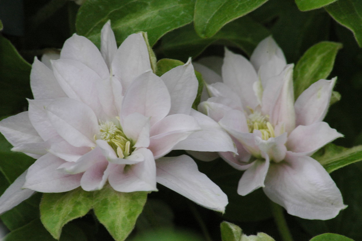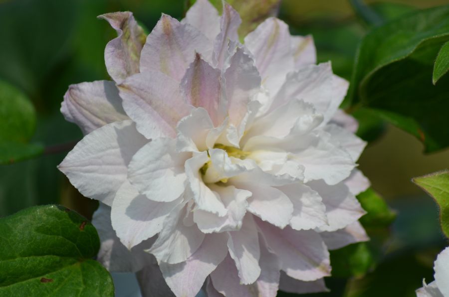 В высоту лиана достигает 2 м. Цветет на прошлогодних побегах. Обычно это происходит в мае-июне. Цветки формируются махровые. Вторая волна начинается в июле-августе, на побегах текущего года. Теперь уже цветки образуются простые или полумахровые. В полном роспуске диаметр цветков равен 6 – 8 см. Лепестки окрашены в белый цвет. Все это время клематис источает упоительный аромат.