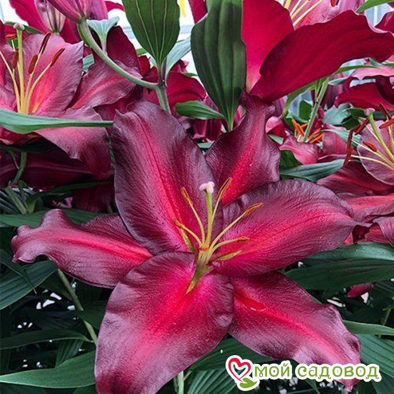 Лилия восточная «Авиньер» — цветущий луковичный многолетник-гибрид. Вырастает до 100-120 см, формирует душистые, очень крупные цветы — до 25 см в диаметре. Окраска темно-бордовая, в середине цветка — более светлая. Лепестки глянцевые. Хорошо смотрится в групповых и одиночных посадках, идеально выглядит в букетах. Время цветения — с июля по сентябрь. Посадка лилии: Глубина посадки лилии зависит от почвы. Если почва легкая – можно углубить на 12-13 см, что составляет 3-4 диаметра луковицы. Если же почва глинистая или тяжелая, достаточно двух диаметров, глубина лунки не более 5 см. В выкопанную ямку насыпьте слой песка, установите луковицу донышком на песок, присыпьте сверху остатками грунта, сверху замульчируйте. Уход за лилией: Пышных бутонов у лилий можно добиться, соблюдая обычные правила ухода: в первый год лилиям не нужна весенняя подкормка, удобрения вносятся разово за сезон, после цветения. Но это лишь в том случае, если перед посадкой вносилось удобрение. Перед началом цветения высокорослые сорта рекомендуется подвязать. После цветения засохшие бутоны удаляют. Полив умеренный: лучше не долить, чем перелить. Если цветок начал чахнуть и имеются подозрения на перелив – смешайте по столовой ложке речного песка и древесной золы, высыпьте под цветок и не поливайте ближайшую неделю. Полив лилии важно проводить под корень, старайтесь исключить попадание воды на листья, это провоцирует ожоги на солнце и распространение грибковых заболеваний.