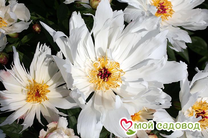 Пион Lois Kelsey (Луис Келси). Необычный сорт. Цветок диаметром 15 см, кремово-белый, простой и полумахровый, плоский, с длинными узкими, глубоко, до самого основания, изрезанными лепестками, отходящими от центра как лучи солнца. Поразительный контраст белых лепестков, красных пестиков и жёлтых коротких тычинок. Высота 80 см. Срок цветения средний. Пион — прекрасное долговечное растение. На одном месте может расти без пересадки 20, 30 и более лет. Важно выбрать для пионов правильное место. Там не должно быть застоя воды ни весной ни осенью. Кроме того, место должно быть солнечное. В нашем интернет-магазине вы сможете купить Пион Травянистый Так же возможно вас заинтересуют Пион «Лорелей» и Пион «Макинак Гранд» .